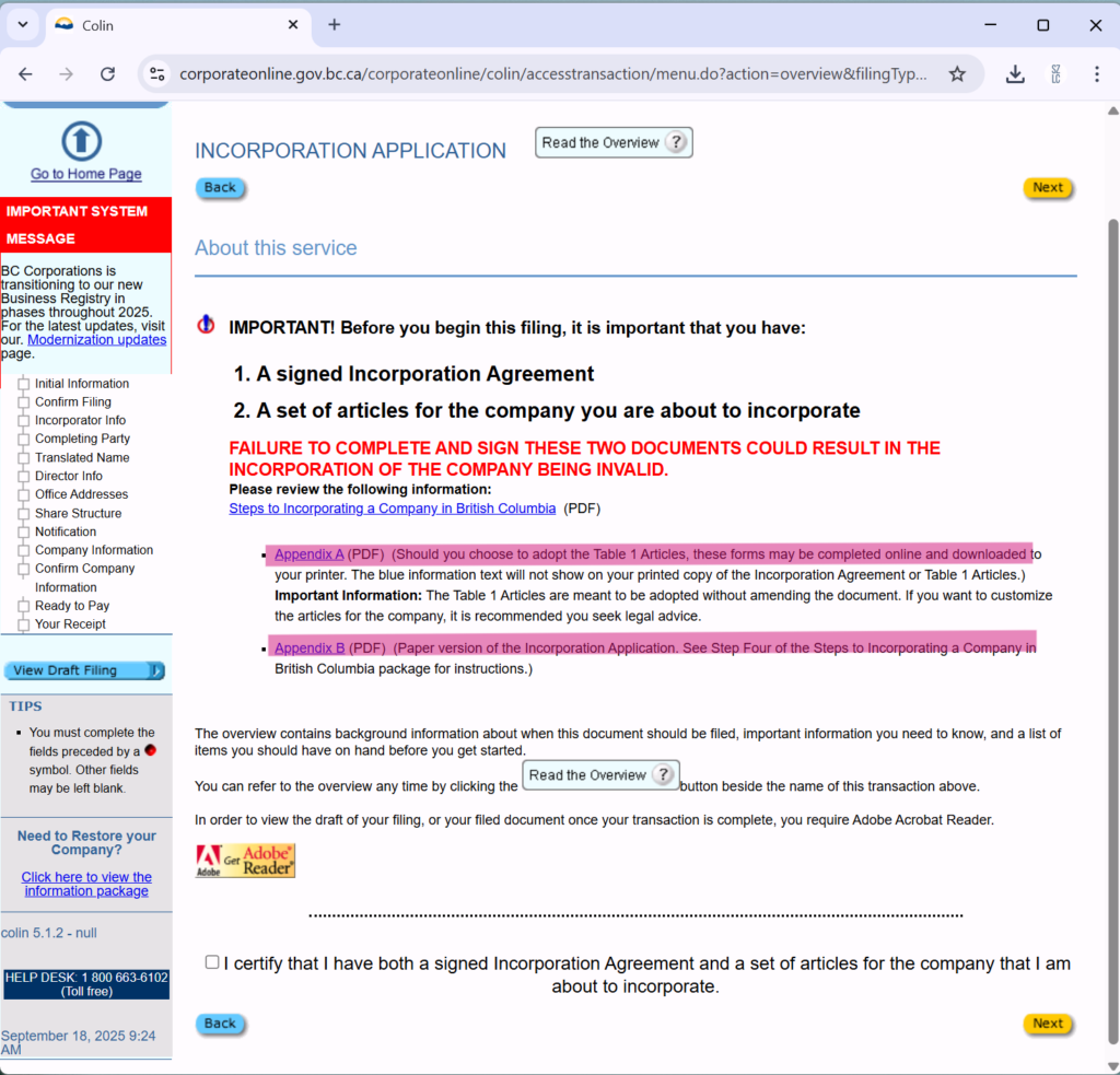 打印出来签完字了,点击页面下方I certify that I have both a signed incorporation Agreement and a set of articles for the company that I am about to incorporate.