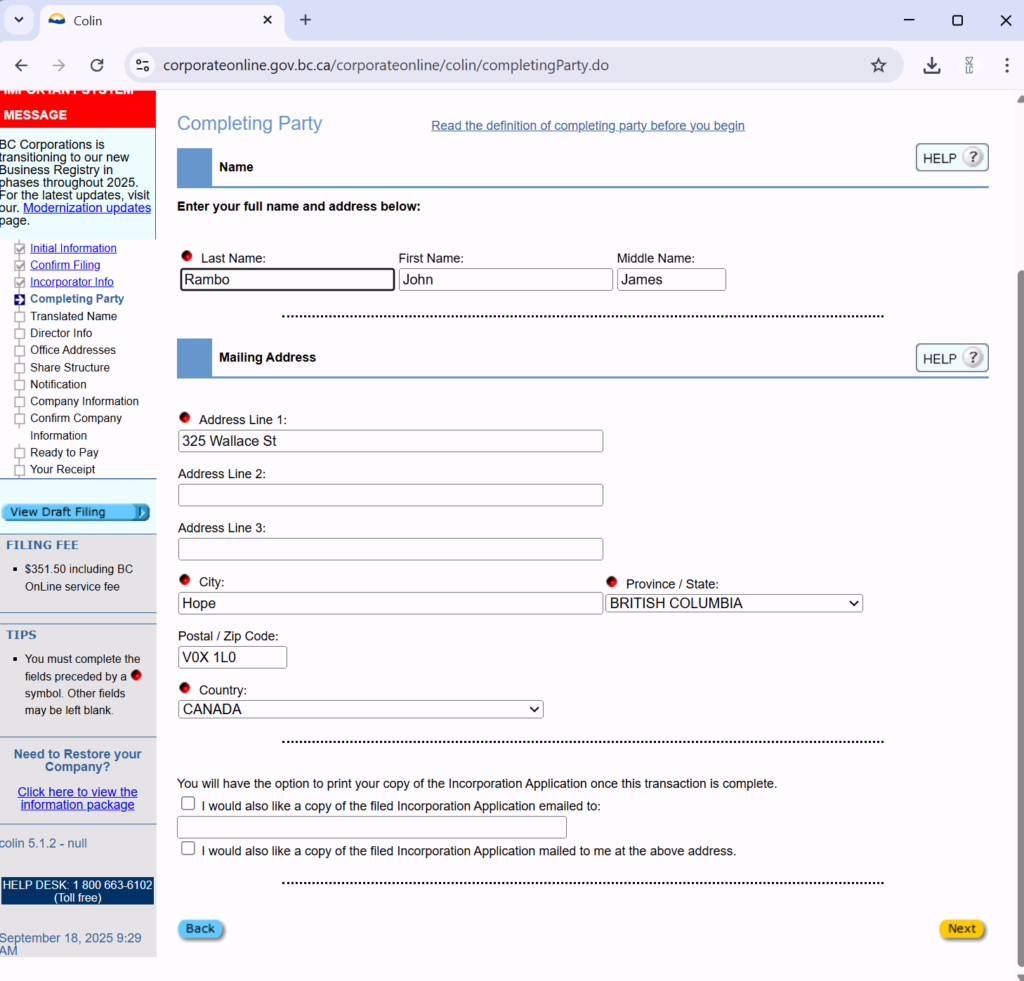 填上Completing Party信息。即填写这份公司注册申请的人的信息。因为是一人公司,填的还是股东名字。