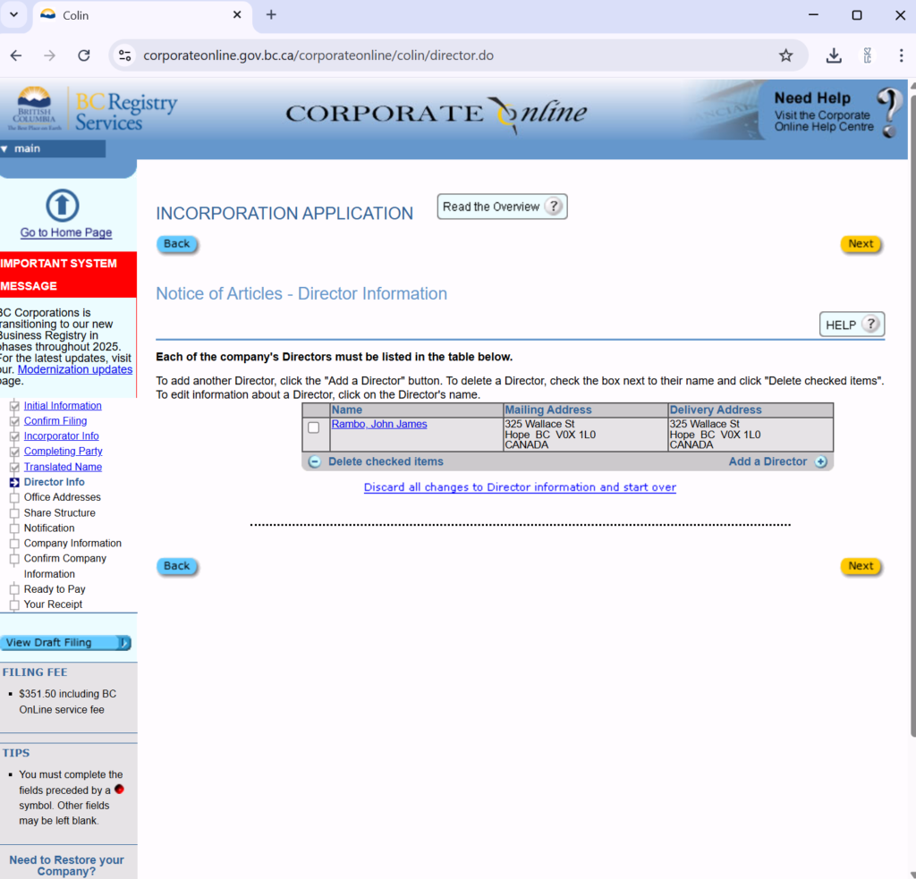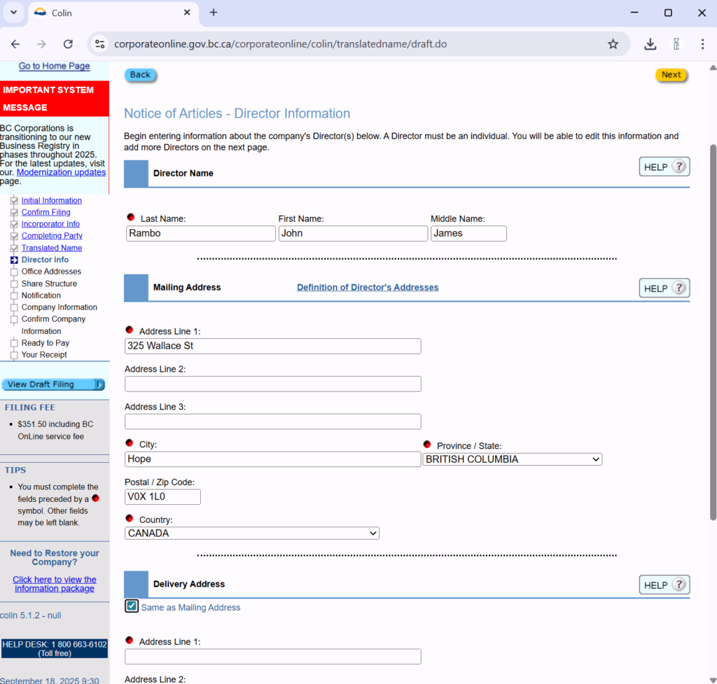 填公司董事名字和地址。董事名字一定和证件上一样,因为银行开户时要看。Mailing Address 和Delivery Address可以填一样。