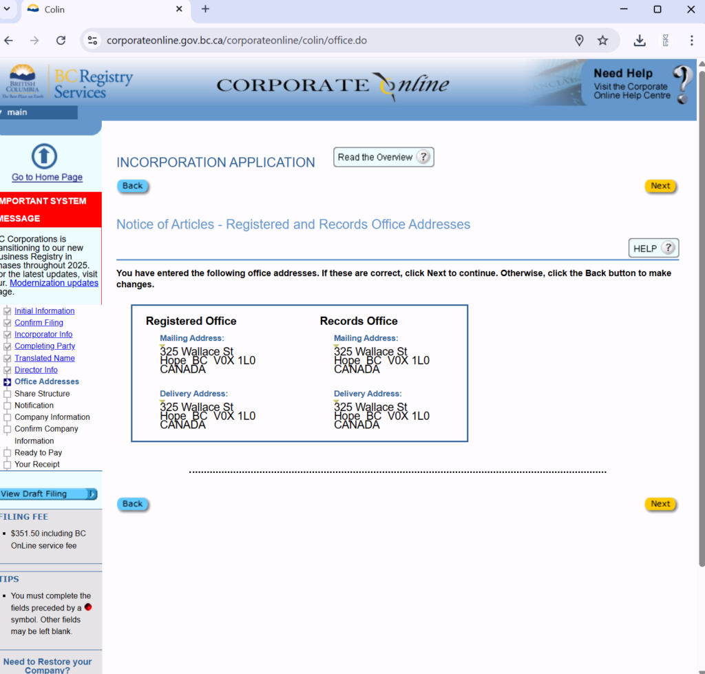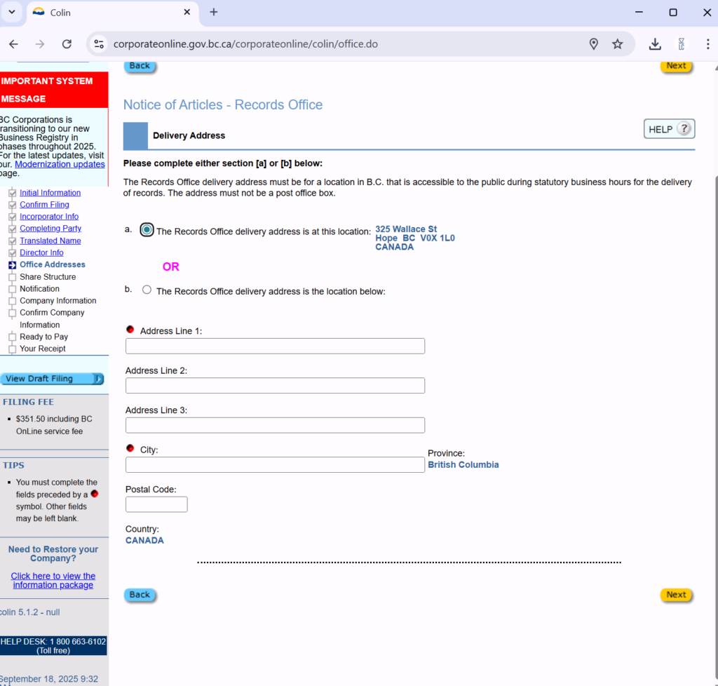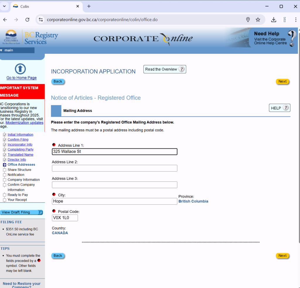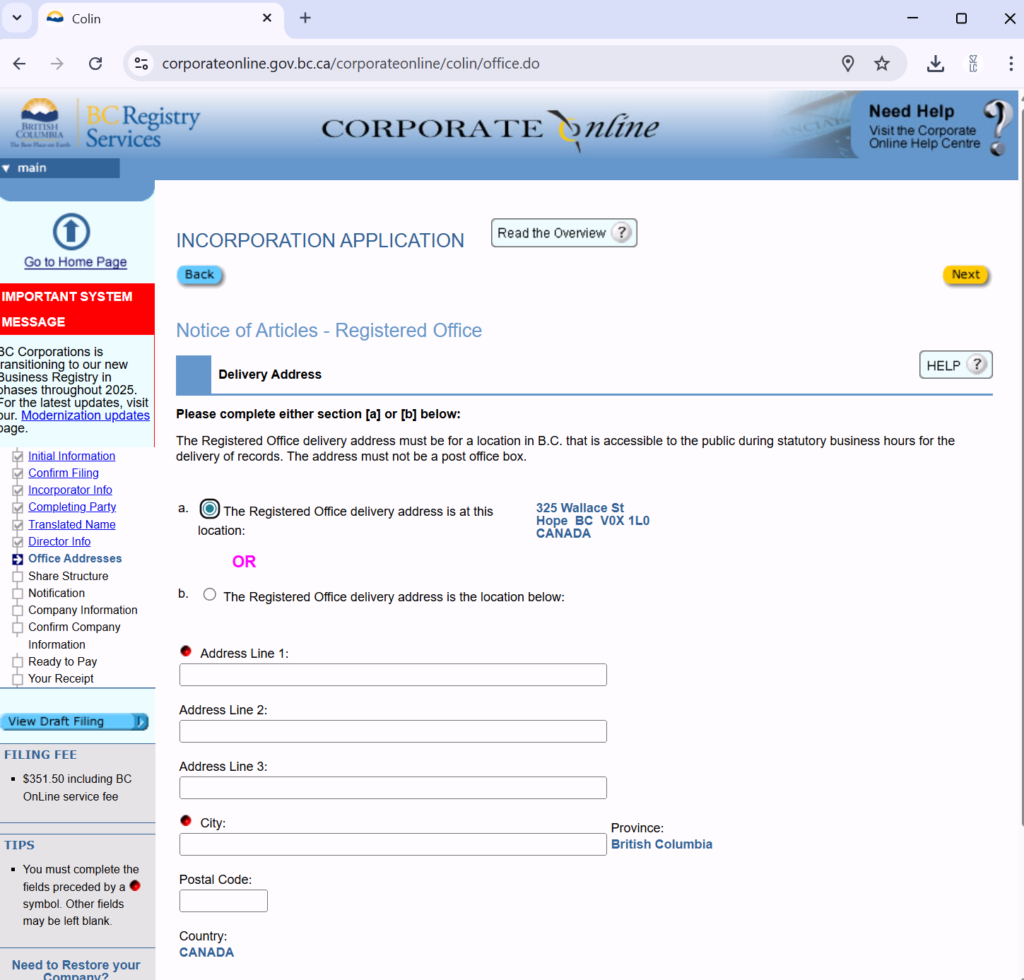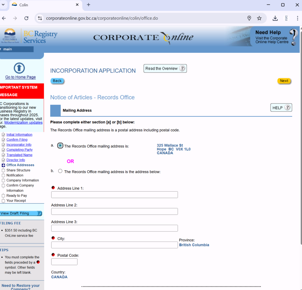 填写公司注册地址。这个地址必须是BC省的真实地址。