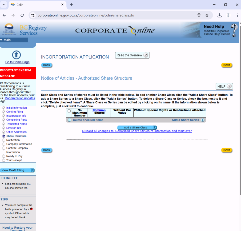 选择file an incorporation Application